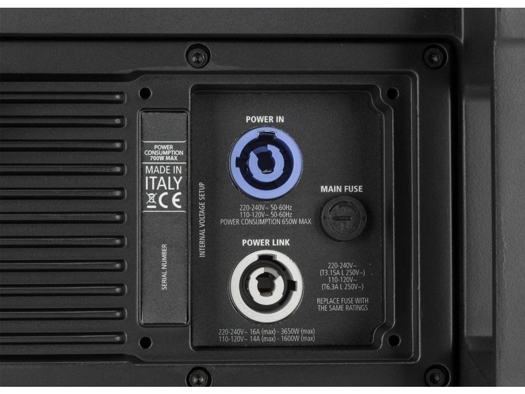 Reproduktory jsou napájeny dvoukanálovým zesilovačem s výkonem 1400 W třídy D. Veškeré zpracování signálu, včetně výhybky, fázové korekce, limitérů a ochran, zajišťuje výkonný DSP procesor.